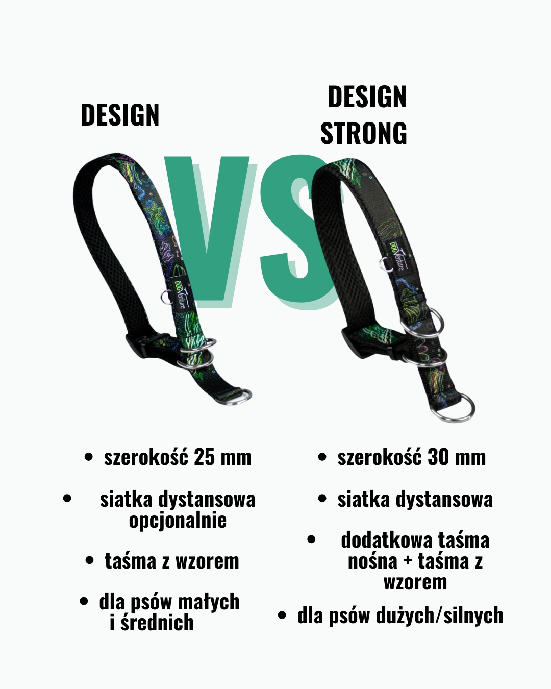 Szelki Guard Design wykonane są z taśmy o szerokości 25 mm. Są miękkie i komfortowe w użytkowaniu, a ich design przyciąga wzrok.